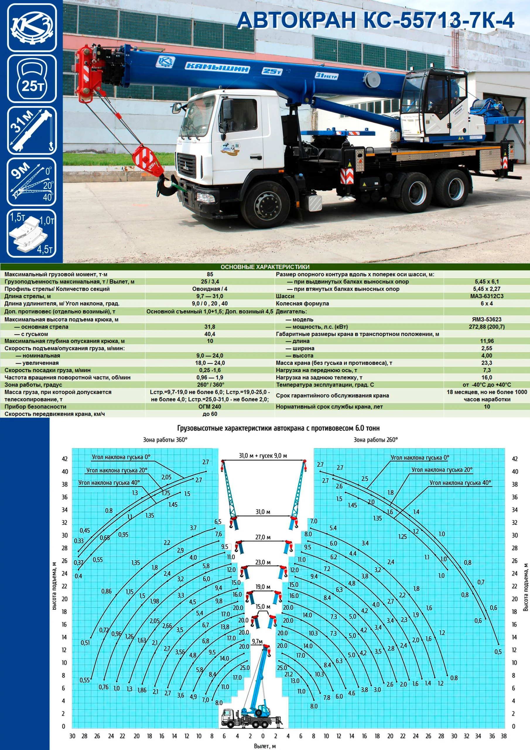 Автокран КС-55713-7К-4 — это современная и производительная крановая установка грузоподъемностью 25 тонн, смонтированная на надежном шасси МАЗ-6312С3. Модель сочетает в себе длинную 31-метровую стрелу, высокую мобильность и соответствие всем дорожным нормам, что делает ее идеальным выбором для работы на рассредоточенных объектах.