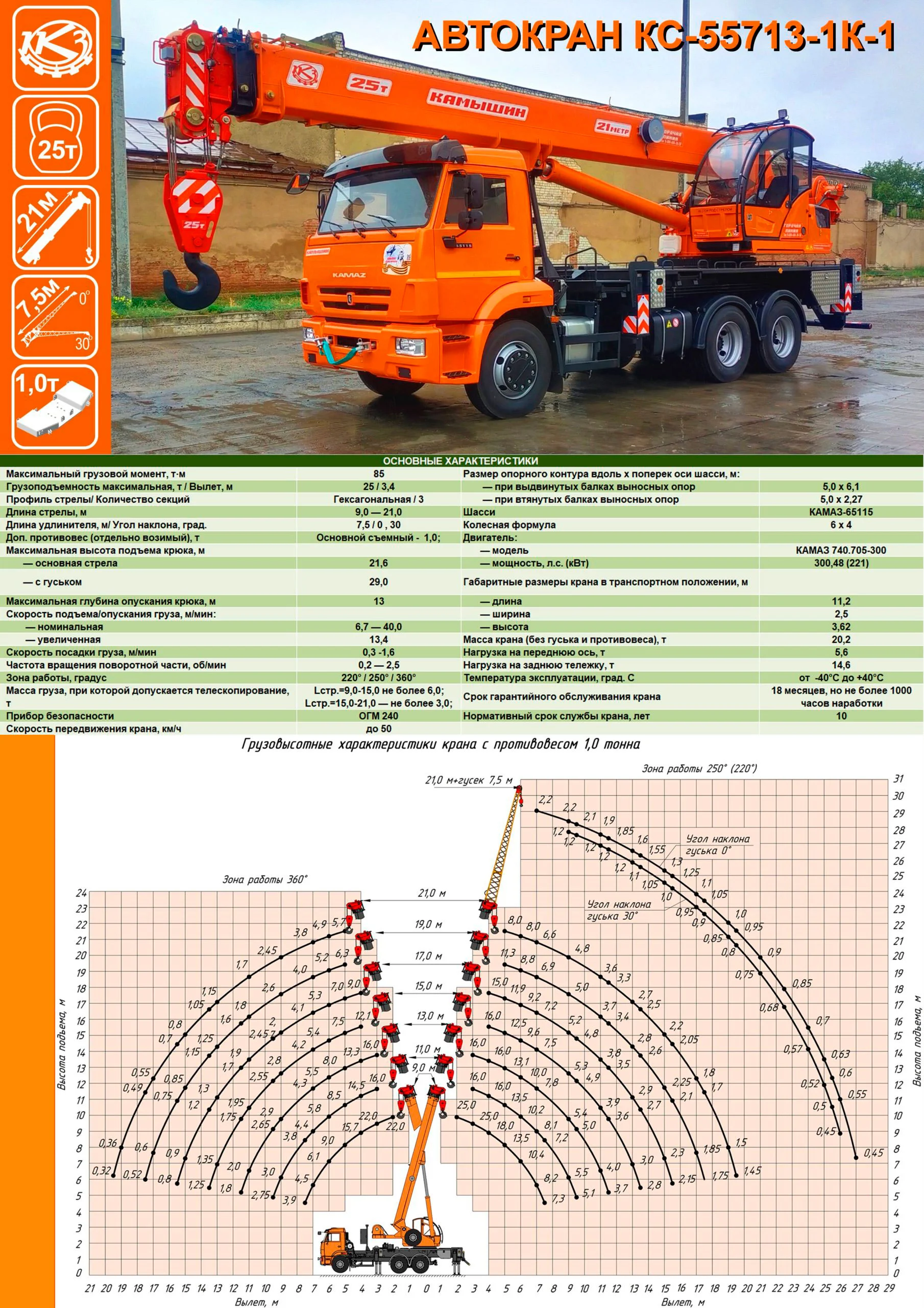 Автокран КС-55713-1К-1 представляет собой современную крановую установку грузоподъемностью 25,0 тонн, смонтированную на надежном шасси КАМАЗ-65515. Оснащен гидравлическим приводом и жесткой подвеской стрелы, что обеспечивает точность и безопасность при работе.