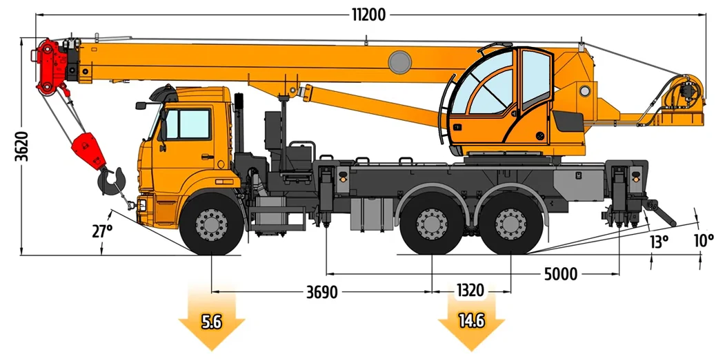 Для максимальной безопасности и устойчивости кран оснащен опорным контуром увеличенного размера 5,0 м х 6,1 м. Это гарантирует надежную фиксацию крана даже при работе с максимальными нагрузками на предельном вылете стрелы.